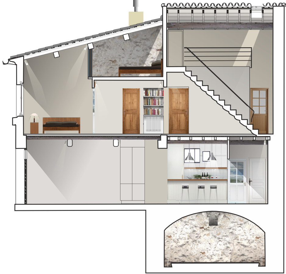 Matériaux utilisés : pierres intérieurs brossées et rejointoyées à la chaux, enduits à la chaux, cloisons intérieures briques (finition plâtre), menuiseries bois (double vitrage), planché bois isolé (billes d’argiles) et contrecollé chêne, sols carrelés (grès cérame, carreaux de ciment et parefeuilles) sur chape légère, toiture tuiles Canal, isolant mince ACTIS Trisolaine © (R=6,1 m². K/W), châssis de toiture VELUX ©.